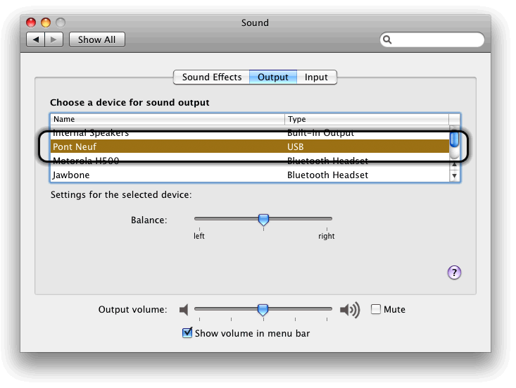 Now, select the “Output” tab and choose “Pont Neuf” as the output device. Music from iTunes and other music sources will then be routed through the Pont Neuf to the Cantata.
